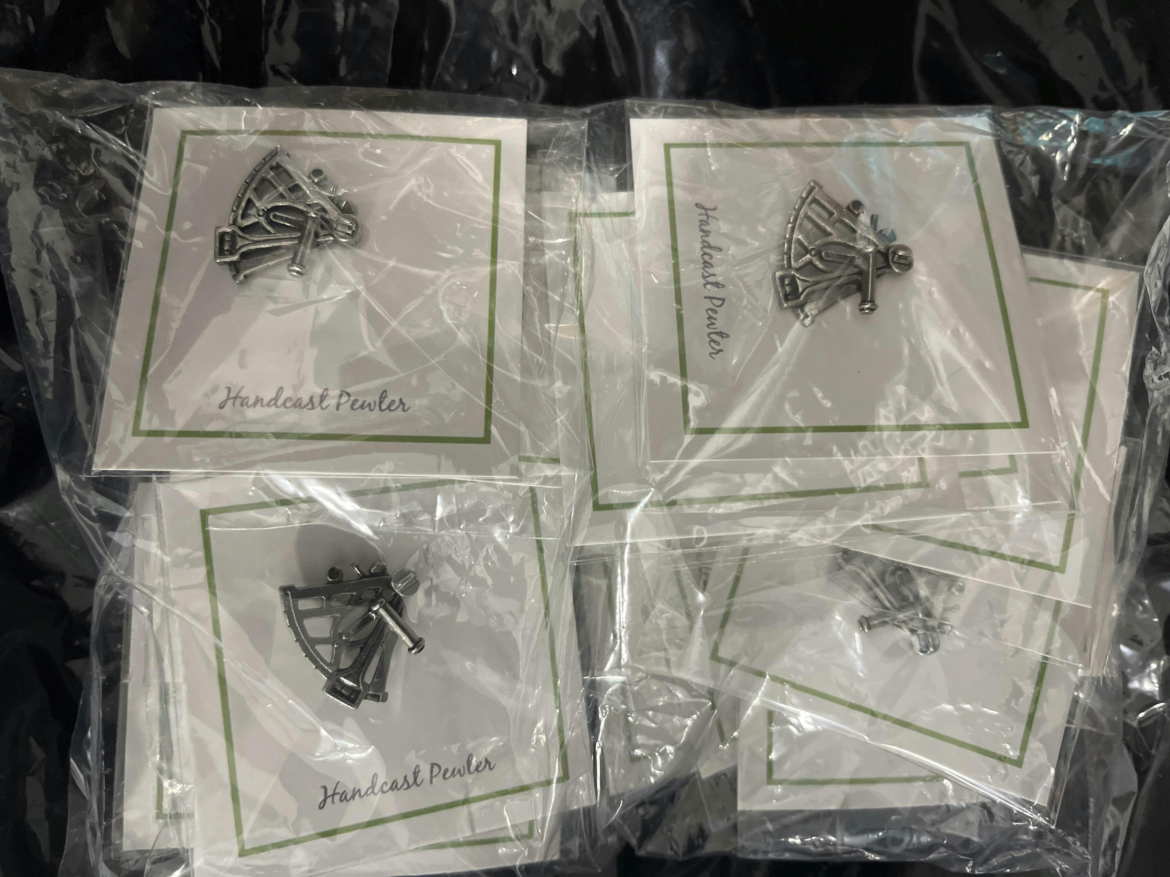 A sextant is a navigational instrument used to measure the angle of elevation of celestial bodies, usually the sun or moon, in order to determine one's location and direction. Acknowledge individuals heading in the right direction with our hand cast, pewter sextant pins.  These navigation pins arrive packaged on our signature presentation card, making them ready for gift-giving!  Our custom card option allows you to design the front of the card to include a logo, information about your event, or a special message.