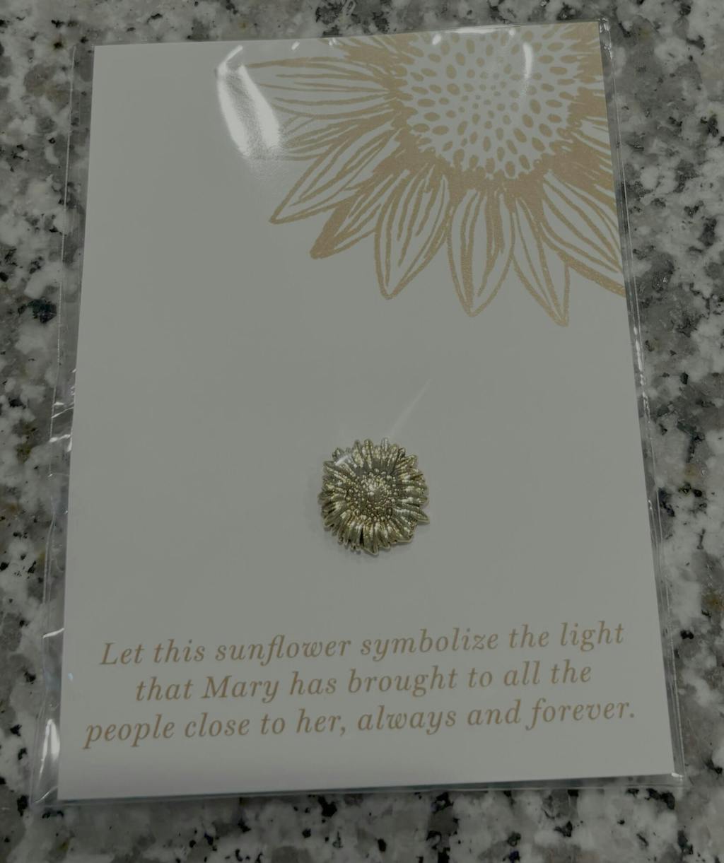 Lisa Branzetti The sunflower lapel pin was a big hit at my sister’s memorial service. Everyone wore it for the service and many commented. This company was easy to work with and did a fantastic job designing the remembrance card.