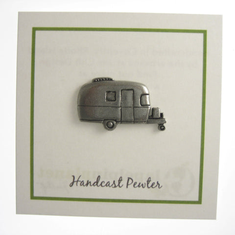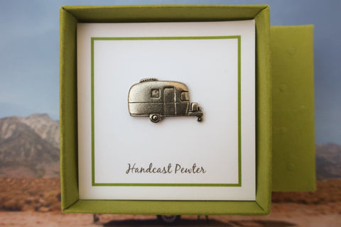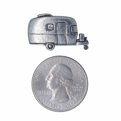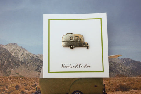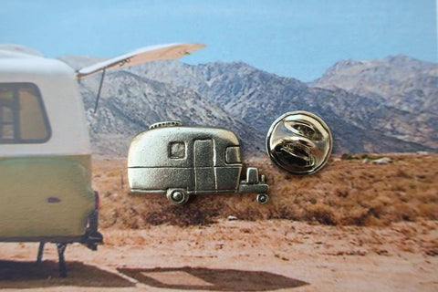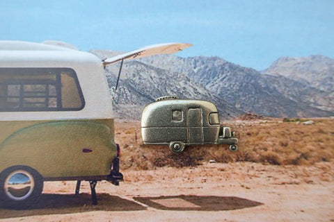 Road trip! Show your passion for travel and camping with our camper pin. Hand cast in solid, lead-free pewter, this camping pin signals that you’re ready to hit the road. All RV pins have a US made, military style clasp back that keeps your pin secure on a coat, hat, or bag. Pass out to your camping buddies, at the next RV stop, or at your camping family reunion. All of our camper pins arrive packaged on our signature presentation cards, making them ready for gift-giving!