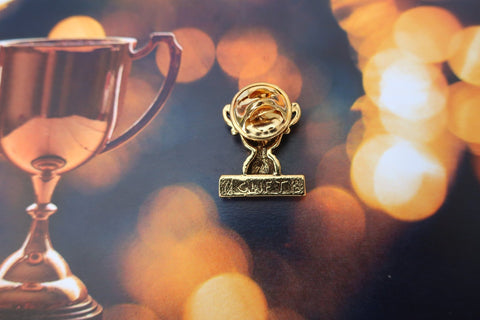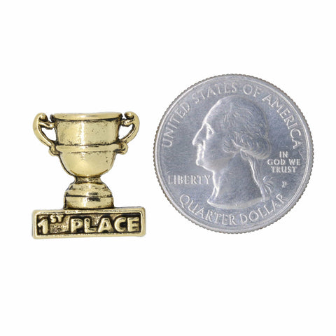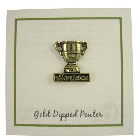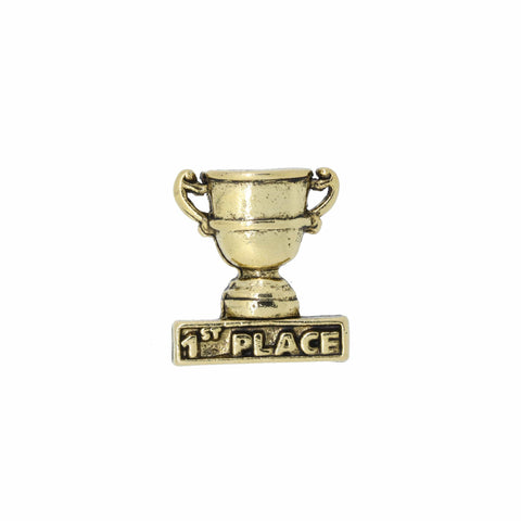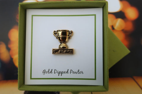 Award the champion with our first-place trophy lapel pin. Hand cast in solid, lead-free pewter and then dipped in gold, our award pins have a military style clasp to keep your pin secure. Award at tournaments, competitions, and award ceremonies. Wear our #1 pin on a jacket, hat, or blazer. All 1st place pins arrive packaged on our signature presentation card, making them ready for gift-giving!