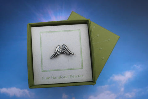 Celebrate an Angel gaining their wings with our hand cast pewter angel wings lapel pin.  Recognize individuals for their guidance and support, for being an angel during a difficult time.  Paired with a custom card with your message, our angel wings pin makes a beautiful remembrance tribute and a treasured addition to a prayer card.