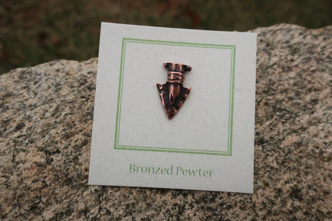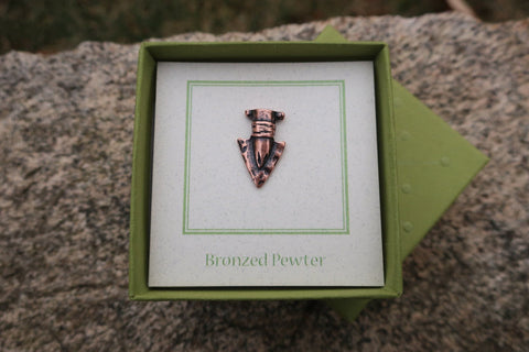 Native Americans used the arrowhead as more than just a weapon. As a talisman, the arrowhead was worn around the neck to ward off the Evil Eye. It symbolized courage, strength, and protection. Native Americans believed the arrowhead could deflect negative energy and allow the wearer to absorb their enemy’s power. Our arrowhead pin is hand cast in solid, lead free pewter and then dipped in copper. All our arrow pins arrive packaged on our signature presentation card, making them ready for gift-giving!