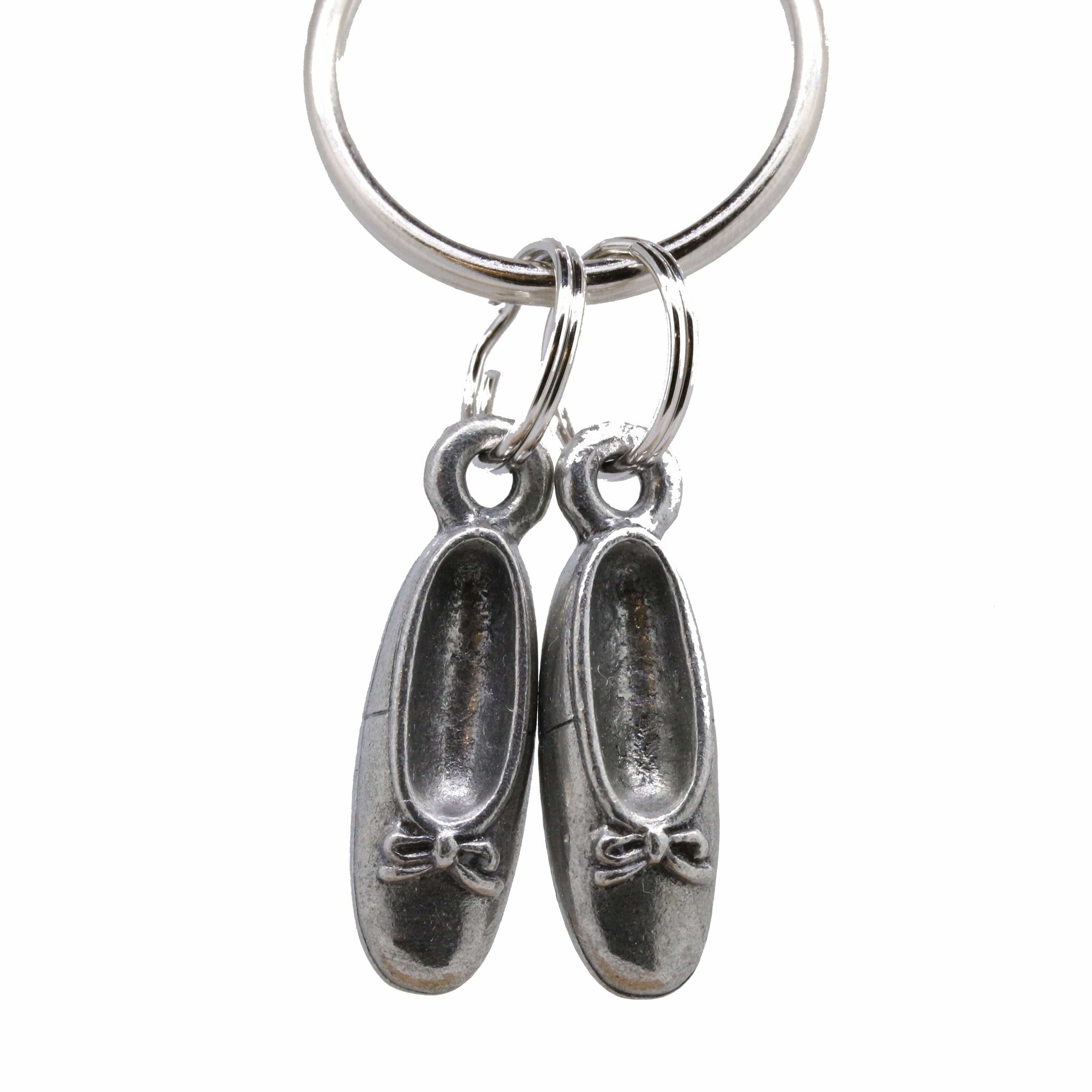 Add some flair or personalization to your set of keys with our hand cast pewter ballet slipper key chain. Our dancer keyring comes with 2 ballet shoes dangling on rings. The perfect gift or accessory for ballerinas to tell their story.