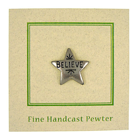 Show someone you believe in them with our believe star pin.  Hand cast in solid, lead-free pewter, our motivational pins have a US made, military style clasp back that keeps your pin secure on a coat, hat, bag, or lanyard.  All inspirational pins arrive packaged on our signature presentation cards, making them ready for gift-giving!  Hosting a motivational speaking seminar, presenting to a graduating class, or inspiring employees?  Our custom card option allows you to design the front of the card to include a logo, information about your event, or a special message.