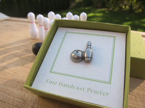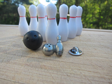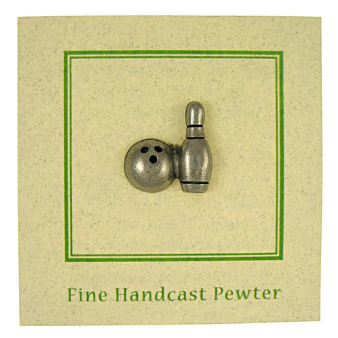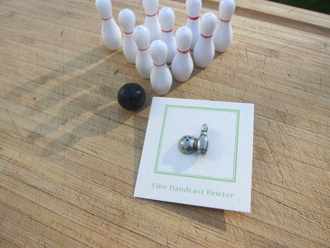 Our bowling pins are hand cast in solid, lead free pewter. The sporting pins have a US made, military style clasp back that keeps it secure on a coat, hat, bag, or lanyard. Gift to your bowling club, award for a perfect score, or for that long-awaited strike. All our bowling ball pins arrive packaged on our signature presentation card, making them ready for gift-giving!
