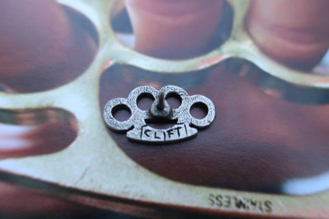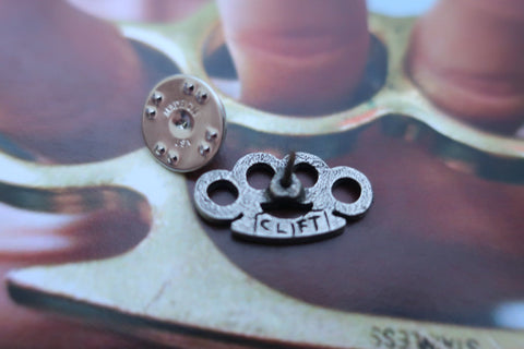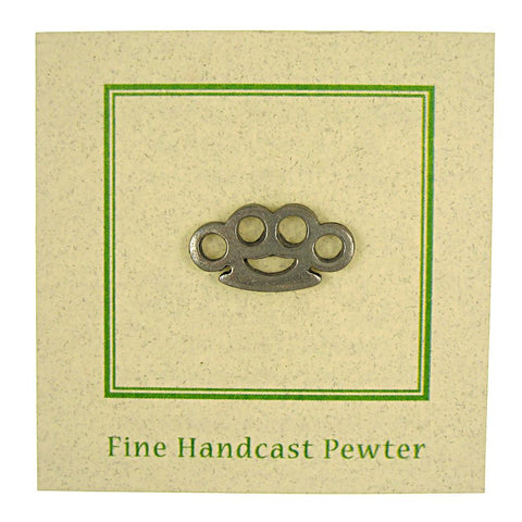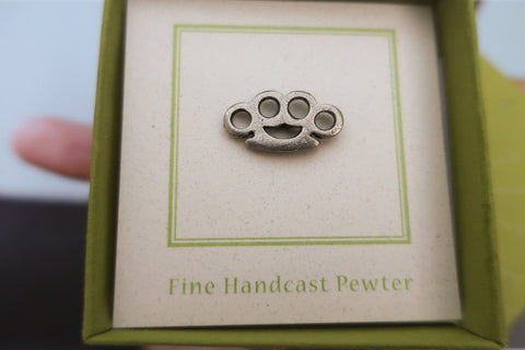 Brass knuckles are commonly believed to have evolved from the ancient Roman "caestus", a type of glove or hand guard made from leather and metal used during boxing matches in gladiatorial events. Hand cast in solid, lead-free Fine Pewter, each piece is an original three-dimensional sculpture signed by the artist, Jim Clift. Our brass knuckle pins come individually packaged on our signature presentation cards, making them a great gift for boxers, or fight night accessories. Hosting an event? Design your own custom card for your pins to arrive on. Include your logo, a quote, or special message.