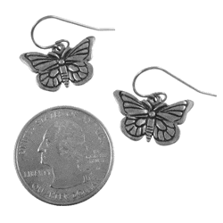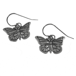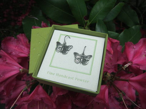 Our butterfly earrings are hand cast in solid, lead-free pewter. They have stainless steel ear wires that are very corrosion resistant, clean, hypoallergenic and sturdy (also with a sleek, shimmering finish that won’t rust or tarnish). The butterflies arrive packaged on our signature presentation card, nestled inside a beautiful gift box, making them ready for gift-giving!