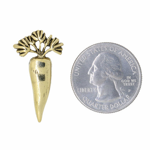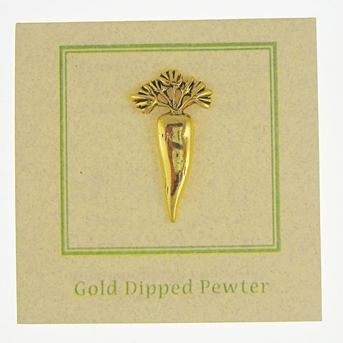 Our carrot pins make great gifts for gardeners, dieticians, and farmers. Hand cast in solid, lead free pewter and then dipped in 22K gold, our vegetable pins arrive packaged on our signature presentation cards, making them ready for gift-giving! Hosting a farmer’s market, health convention, or part of a master gardeners’ group? Our custom card option allows you to design the front of the card to include a logo, information about your event, or a special message.