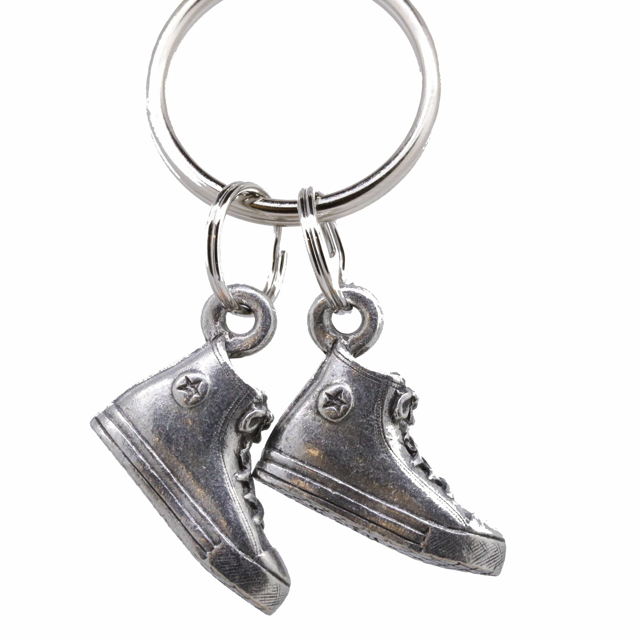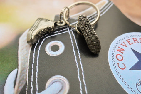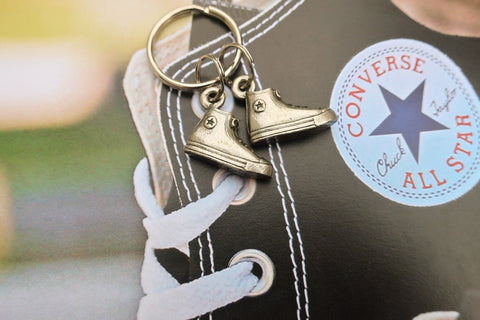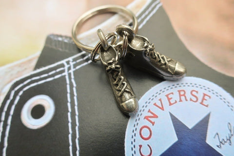 Add some flair or personalization to your set of keys with our hand cast pewter chucks key chain. Our converse sneaker keyring comes with 2 Chuck Taylor shoes dangling on rings. The perfect gift or accessory for hipsters to tell their story.