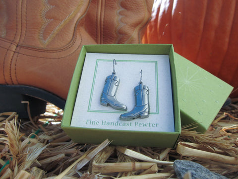 Our cowboy boot earrings are hand cast in solid, lead-free pewter. They have stainless steel ear wires that are very corrosion resistant, clean, hypoallergenic and sturdy (also with a sleek, shimmering finish that won’t rust or tarnish). The boot dangles arrive packaged on our signature presentation card, nestled inside a beautiful gift box, making them ready for gift-giving!