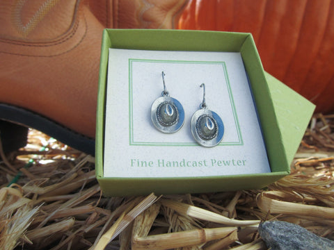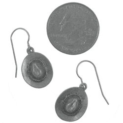 Our cowboy hat earrings are hand cast in solid, lead-free pewter.  They have stainless steel ear wires that are very corrosion resistant, clean, hypoallergenic and sturdy (also with a sleek, shimmering finish that won’t rust or tarnish).  The rodeo dangles arrive packaged on our signature presentation card, nestled inside a beautiful gift box, making them ready for gift-giving!