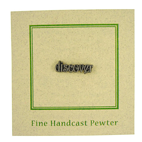 Encourage someone to learn new things with our discover pin. Hand cast in solid, lead-free pewter, our inspirational pins have a US made, military style clasp back to keep your pin secure on a coat, hat, or bag. Our motivational pins arrive packaged on our signature presentation cards, making them ready for gift-giving!