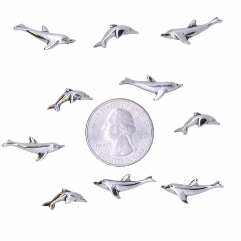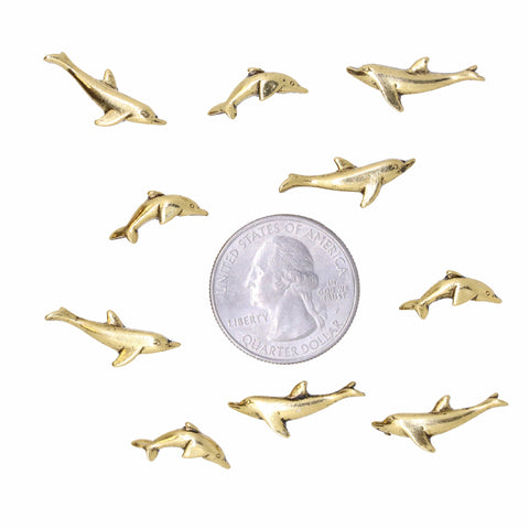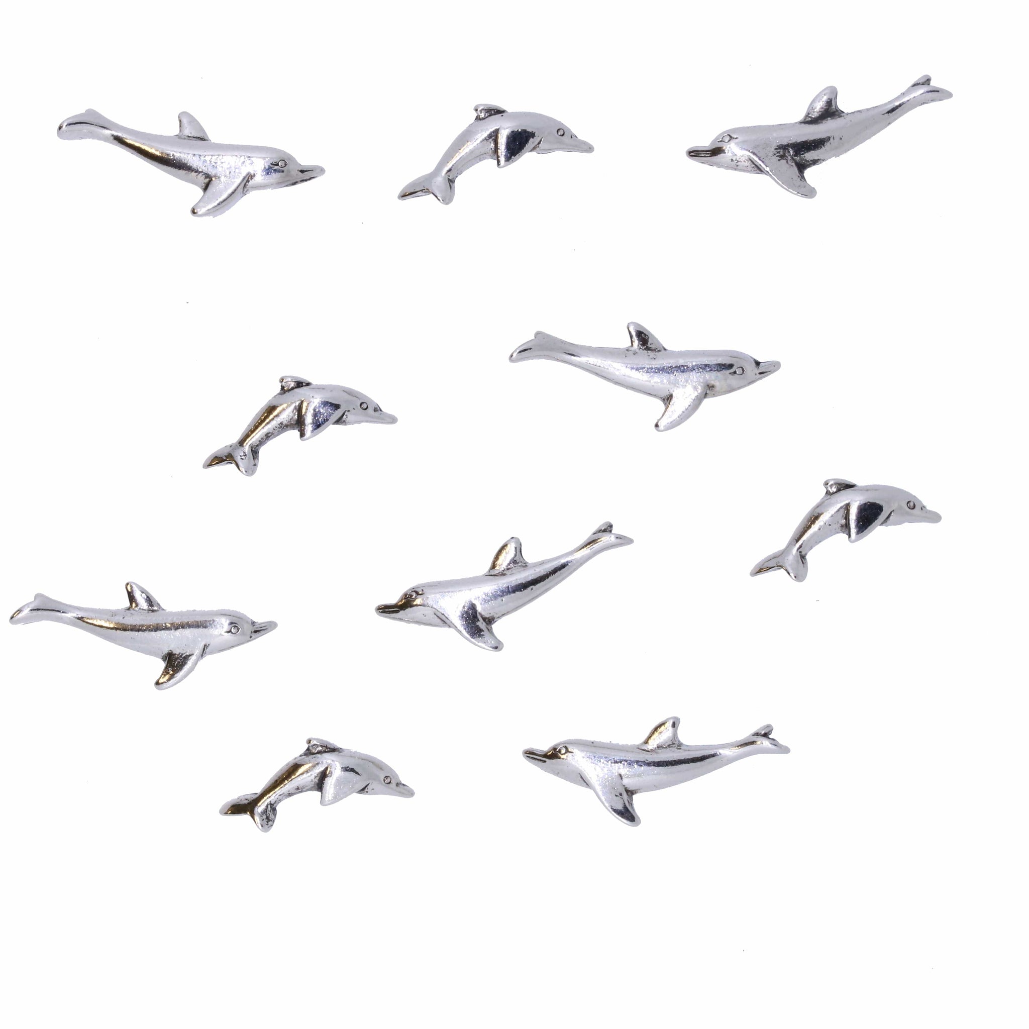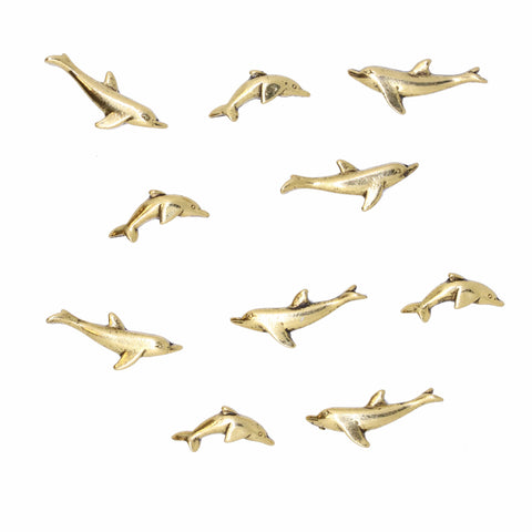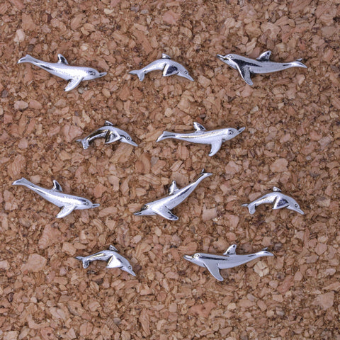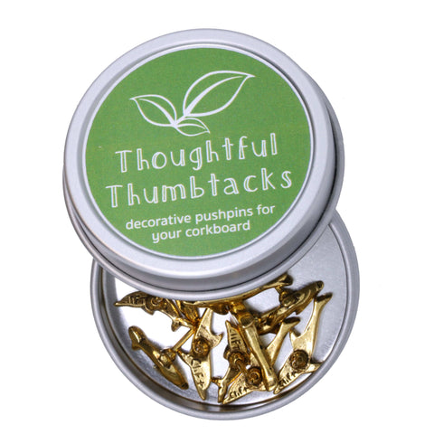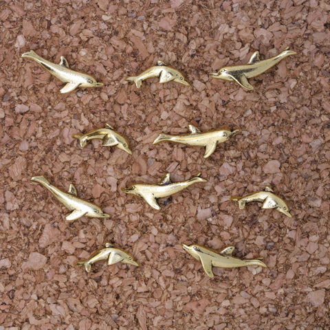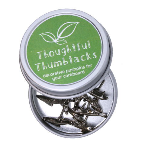 Dolphin thumbtacks to swim across your corkboard. You’ll never be far from the ocean with our hand cast pewter pushpins in your choice of a gold or silver finish. These miniature three-dimensional sculptures are perfect for posting notes, lists or recipes on a corkboard.  Each set contains 10 pieces packaged in an attractive gift tin.