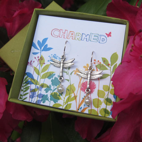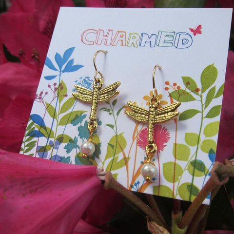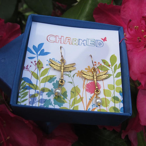 Items of our Charmed Earring Collection are hand cast in our studio in fine, lead free pewter.  They are then either gold or sterling silver dipped.  The ear wires are either 14K gold or sterling silver.  The earrings come packaged on our Charmed Collection card.  Sterling silver earrings come in a complimentary sage green gift box, and our gold earrings come in our royal blue gift box.  With such a charming collection, you will want to collect them all!