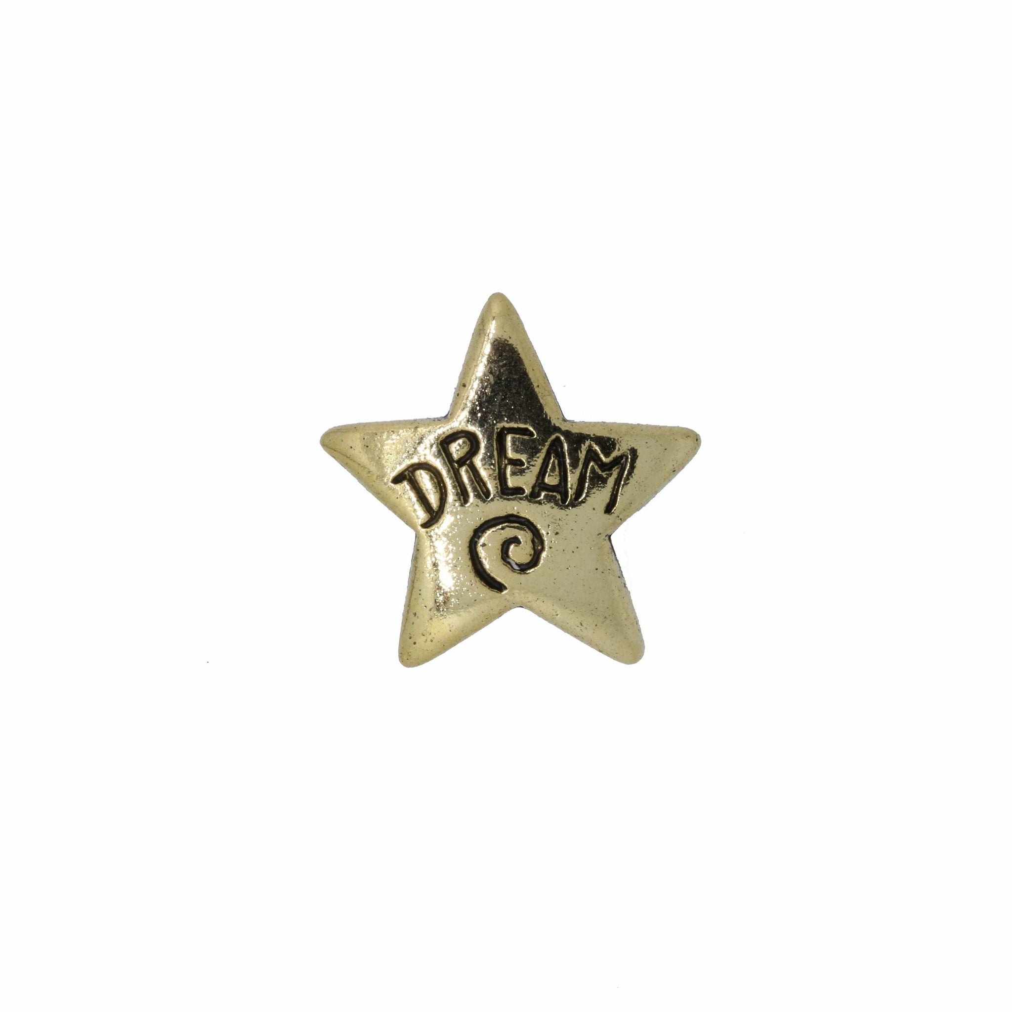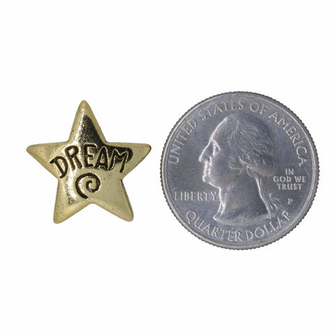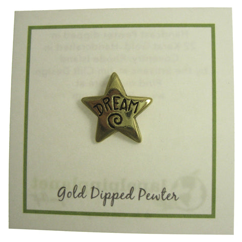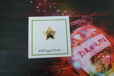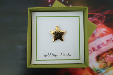 Inspire someone to follow their passion with our dream star pin. Hand cast in solid, lead-free pewter and then dipped in 22K gold, our motivational pins have a US made, military style clasp back that keeps your pin secure on a coat, hat, bag, or lanyard. All inspirational pins arrive packaged on our signature presentation cards, making them ready for gift-giving! Hosting a motivational speaking seminar, presenting to a graduating class, or inspiring employees? Our custom card option allows you to design the front of the card to include a logo, information about your event, or a special message.