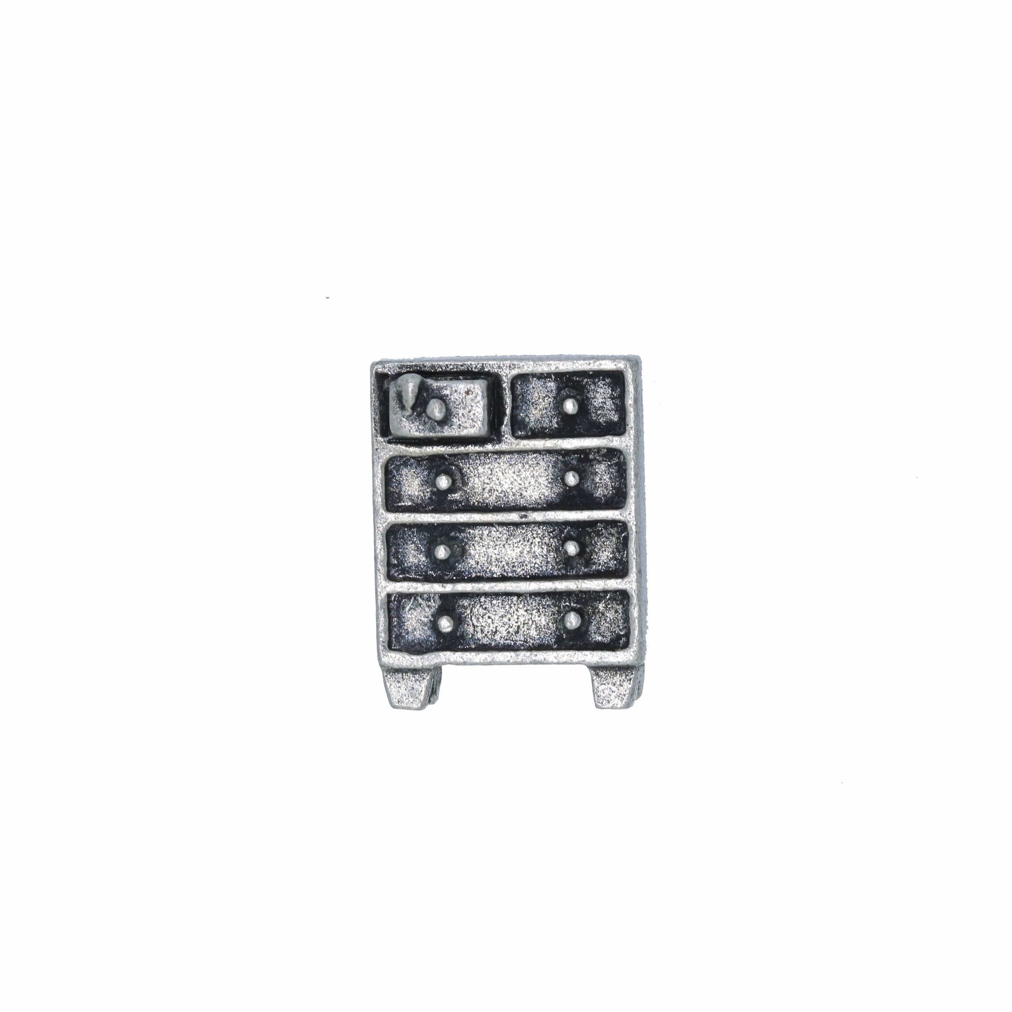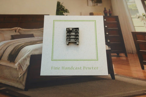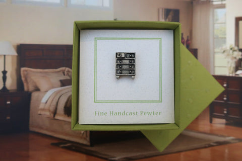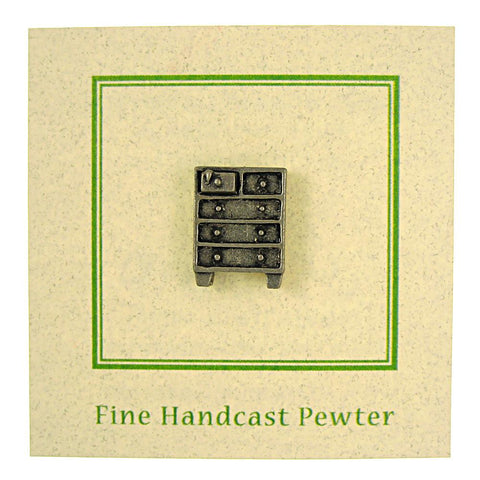 Dressers were widely used in England beginning in Tudor times, when they were no more than a side table occasionally fitted with a row of drawers. Our dresser pin is hand cast in solid, lead-free pewter. Our bedroom furniture pins have US made, military style clasp backs to keep your pin secure on a coat, hat, or bag. The bureau pins arrive packaged on our signature presentation cards, making them ready for gift-giving!