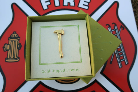 Our firefighter axe pins are hand cast in solid, lead-free pewter and then dipped in 22 karat gold. All of our first responder pins have a US made, military style clasp backing that keeps your rescue pins secure on a coat, hat, bag, or lanyard. Award our fire fighter pins to heroes going above and beyond; all of our firefighting pins arrive packaged on our signature presentation card, making them ready for gift-giving!