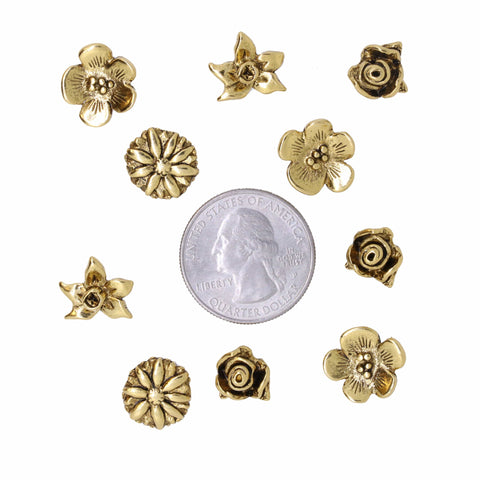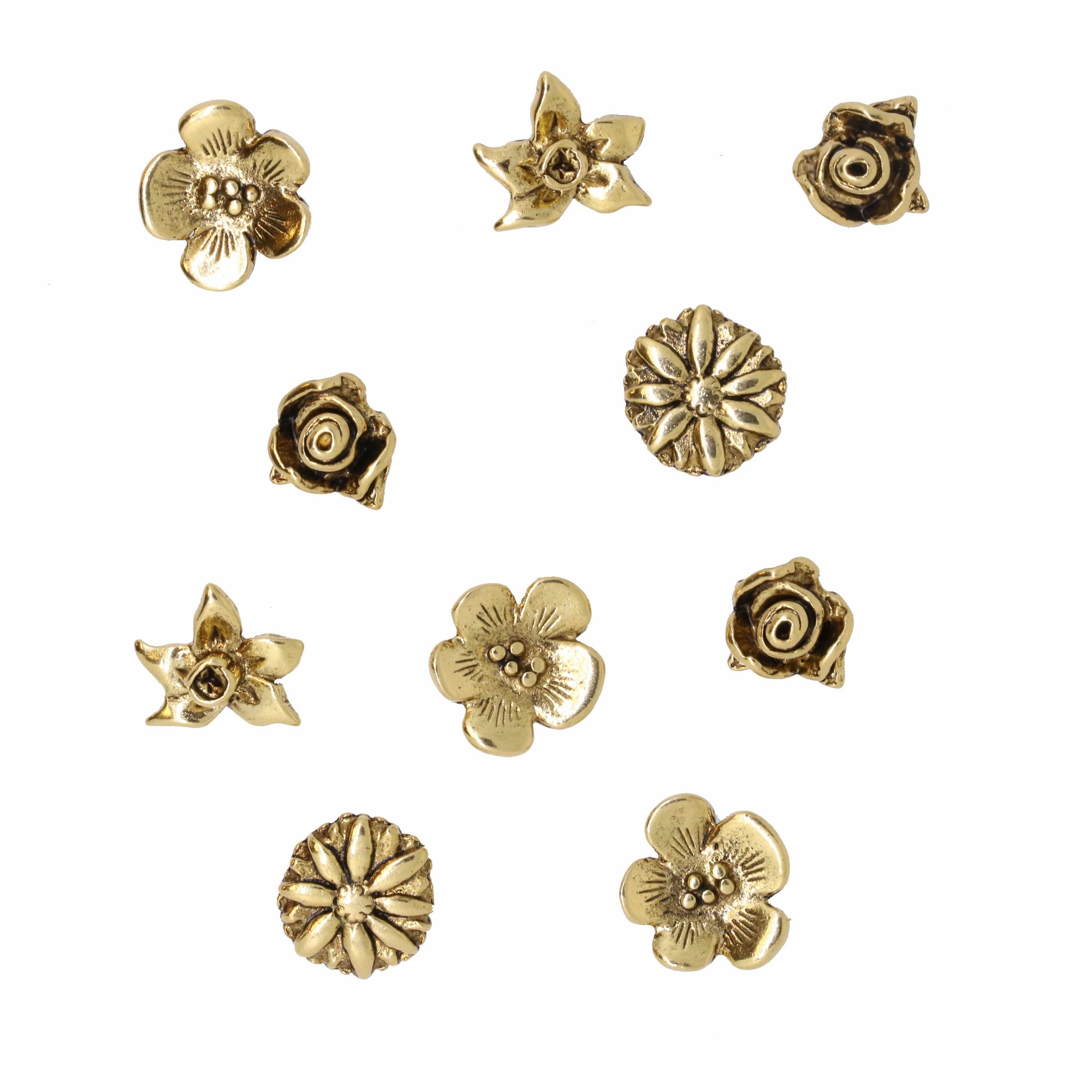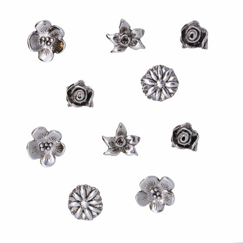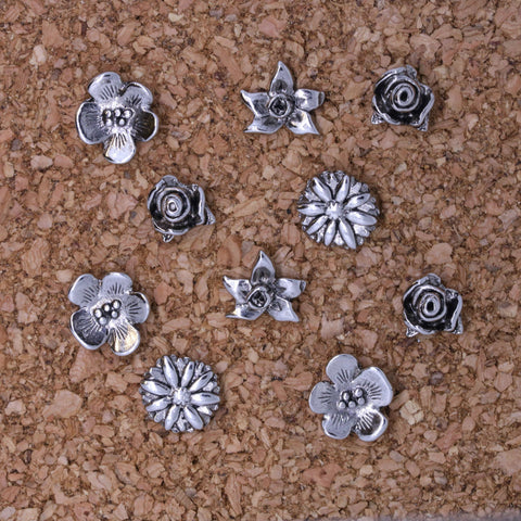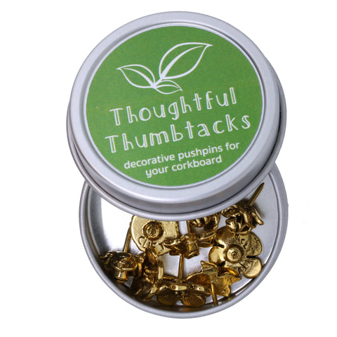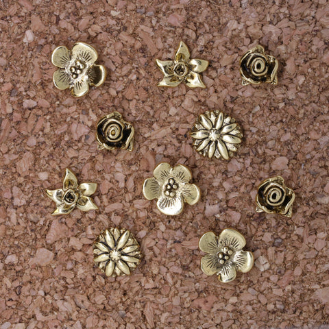 Our flowers will last a lifetime while dressing up any boring cork board. These miniature three-dimensional sculptures are perfect for posting recipes, notes or lists.  Set of 10 flower pushpins in your choice of a gold or silver finish arrive in our signature gift tin.