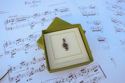 Show off your love for the arts and music with our g-clef lapel pin. Hand cast in solid, lead free pewter, our music pins make a statement. Gift to a music teacher, buy for the band, or fundraise for the arts with our handmade lapel pins. All of our pins come packaged on our signature presentation cards, and are ready for gift-giving! Hosting an event or running a charity? Accompany the pin with a custom card that allows you to add your logo, message, or own design to the front of the card.