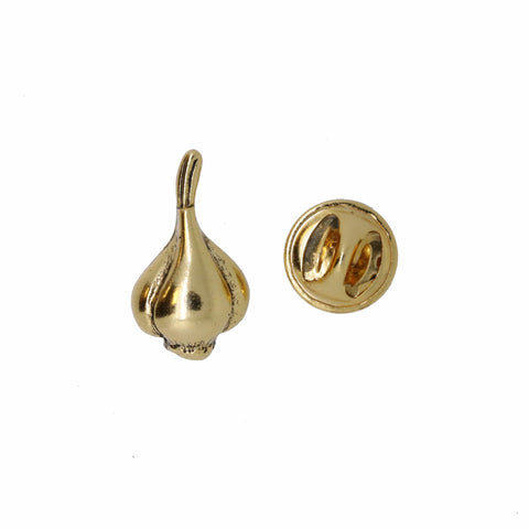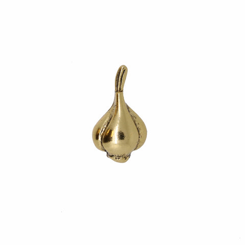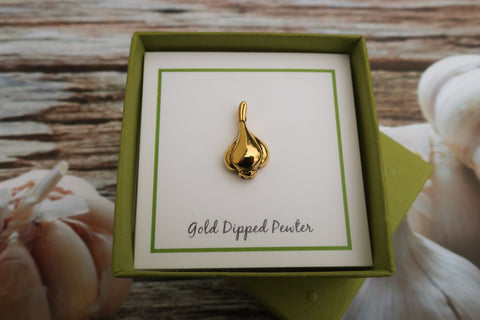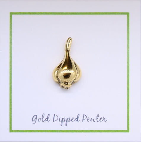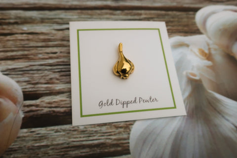 Garlic was thought to promote strength, so soldiers wore it into battle. Parents placed it under their children's pillows to protect them while they slept. Brides carried a clove of garlic for good luck and to keep evil far from her on her big day. It is placed in the home to guard against the intrusion of evil, to keep out robbers and thieves, and is hung over the door to repel envious people. Worn, garlic guards against foul weather as well as monsters, and it also shields you from the blows of your enemy. Our garlic pin is easy to wear as it has a US made, military style clasp back to keep it secure on a coat, hat, bag, or lanyard. The garlic pin is hand cast in solid, lead-free pewter and then dipped in 22K gold, and will help you ward off evil spirits without the unpleasant smell of garlic. Gift to your culinary friends, your superstitious group, or a bride to be, our cooking pins arrive packaged on our signature presentation cards, making them ready for gift-giving!