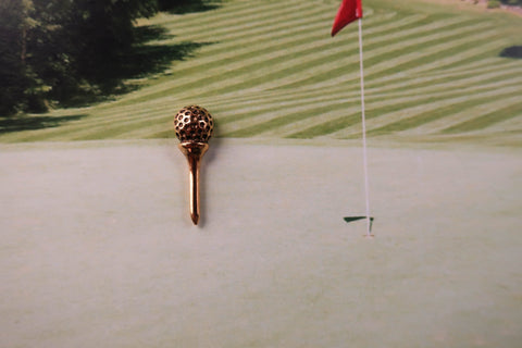 Hit the greens wearing our golf tee pin. Hand cast in solid, lead-free pewter and then dipped in 22K gold, our golfing pins have a US made, military style clasp back to keep your pin secure on a polo, coat, or bag strap. Our golf pins arrive packaged on our signature presentation cards, making them ready for gift-giving! Hosting a tournament, passing out to your tee time group, or awarding the golf team? Our custom card option allows you to design the front of the card to include a logo, information about your event, or a special message.