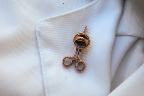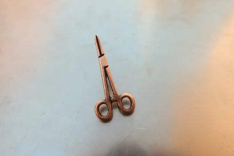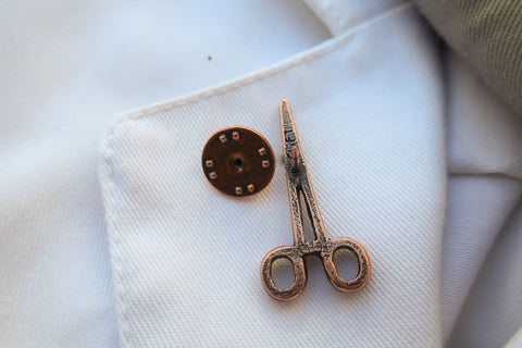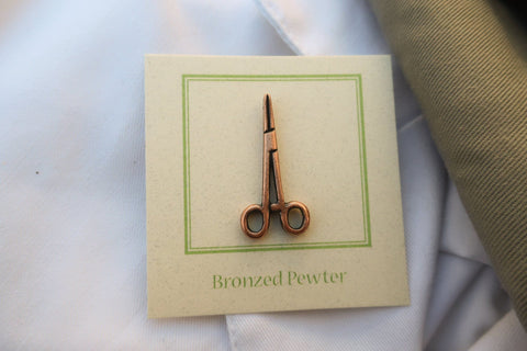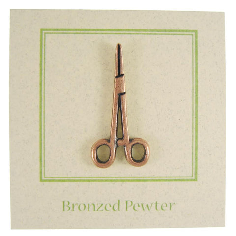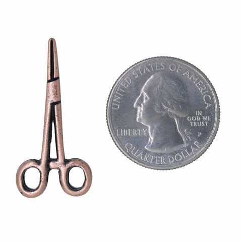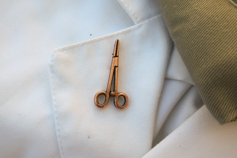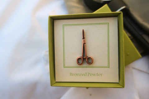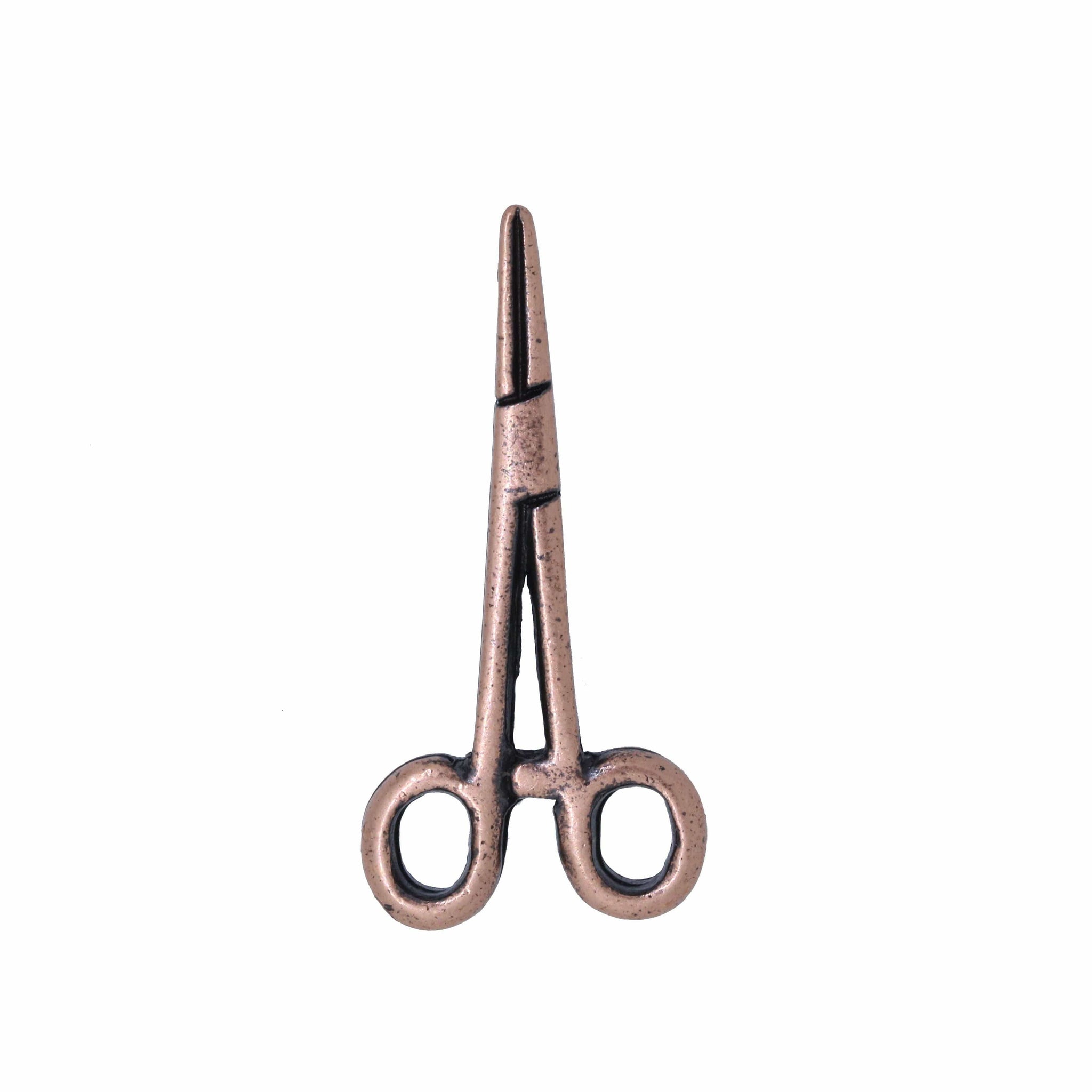 Show off your surgical expertise with our hemostat pin. Hand cast in solid, lead-free pewter and then dipped in copper, our surgical instrument pins have a US made, military style clasp back to keep your pin secure on your white coat, scrubs, name badge, or lanyard. Our surgery pins arrive packaged on our signature presentation card, making them ready for gift-giving! Hosting a medical instrument convention, acknowledging the great work of your operating room, or passing out to medical students? Our custom card option allows you to design the front of the card to include a logo, information about your event, or a special message.