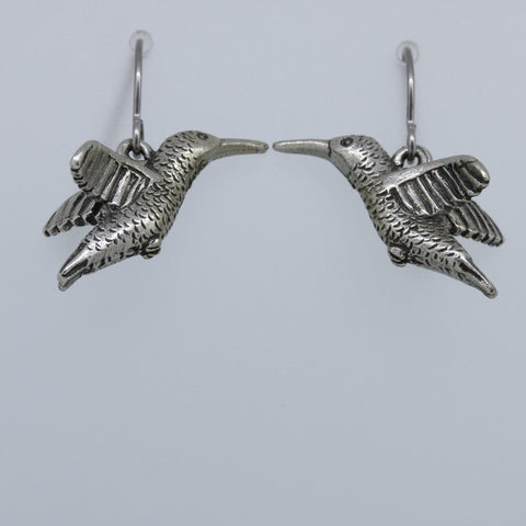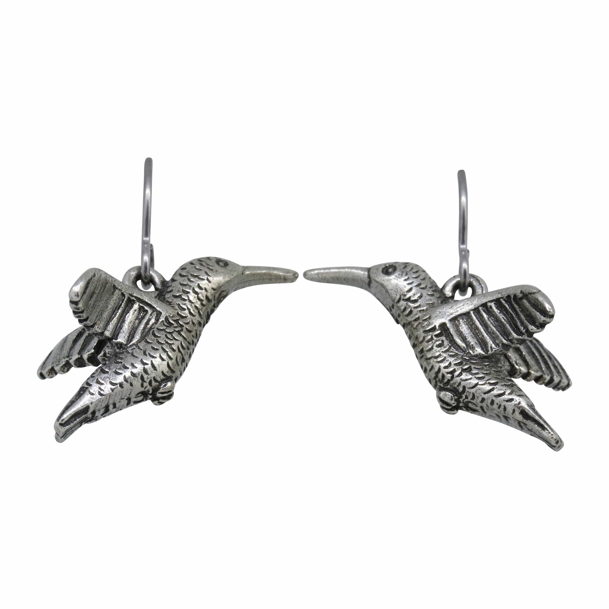 Our hummingbird earrings are hand cast in solid, lead-free pewter. They have stainless steel ear wires that are very corrosion resistant, clean, hypoallergenic and sturdy (also with a sleek, shimmering finish that won’t rust or tarnish). The bird dangles arrive packaged on our signature presentation card, nestled inside a beautiful gift box, making them ready for gift-giving!