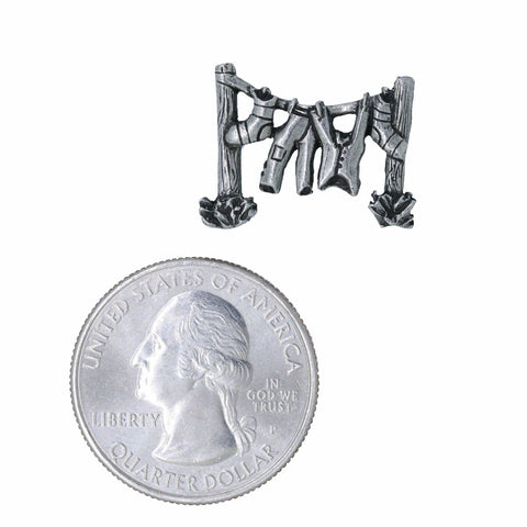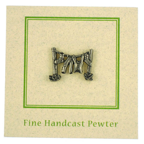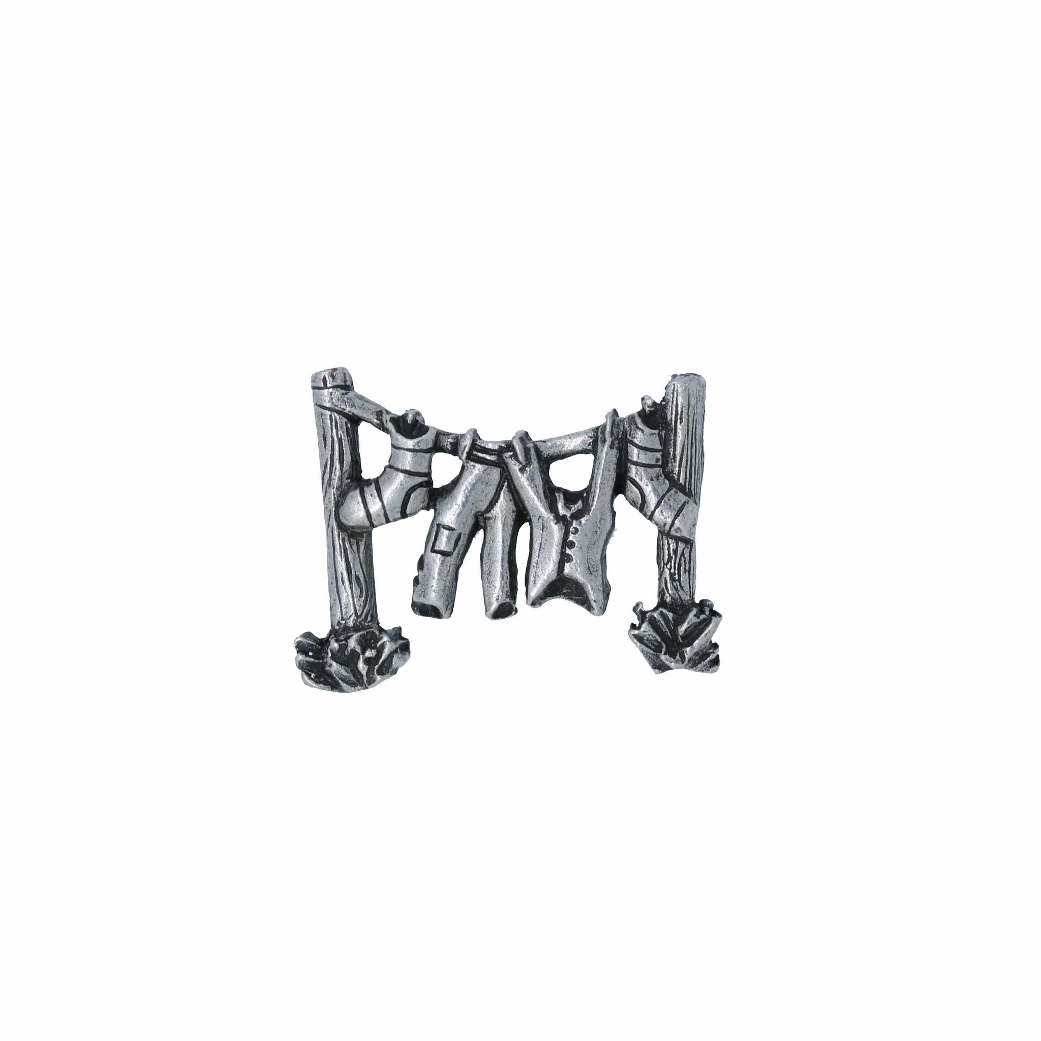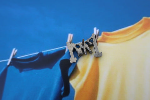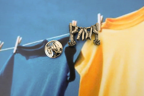 Our laundry pin is hand cast in solid, lead-free pewter. The clothes line pins have a US made, military style clasp back to keep your pin secure on an apron, coat, or bag. All chore pins arrive packaged on our signature presentation cards, making them ready for gift-giving!