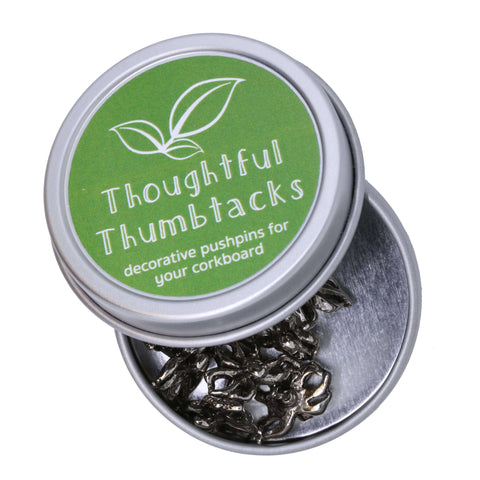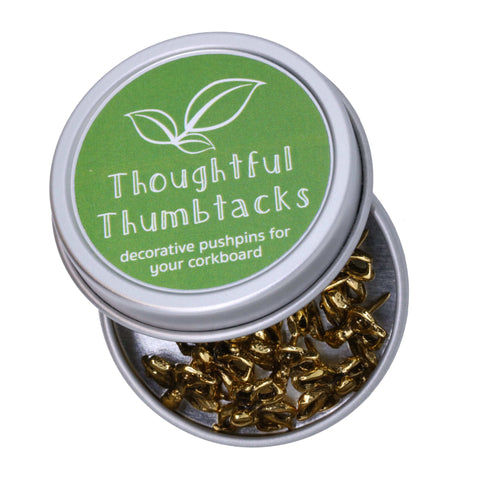 Each set contains 10 hand cast pewter pushpins in your choice of a 22K gold or silver finish. They arrive packaged in our attractive gift tin. $15.95 per set. Hand cast in solid, lead-free pewter in our studio in Coventry, RI, our pushpins will make your memos, photos, and postings really stand out!