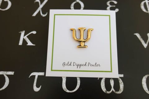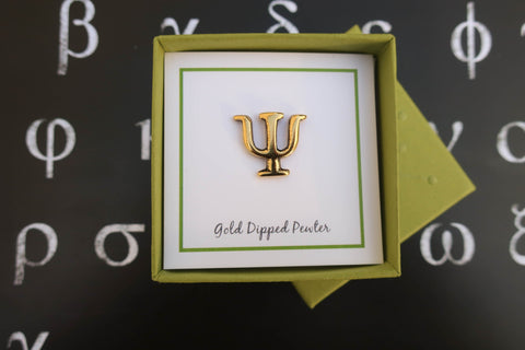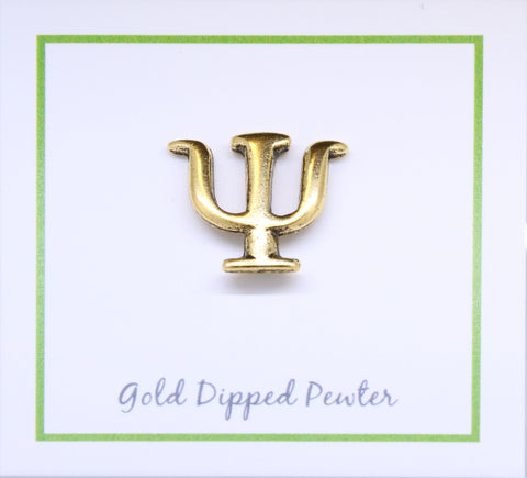Psi is the 23rd letter in the modern Greek alphabet. It is the first letter in the Greek word for psychology. The root word psyche meaning life, soul, and heart in Greek. In physics it represents an elementary particle named Psi. It may be used to represent an angle in trigonometry, and it represents the wave function in Quantum Mechanics. Our Psi lapel pin is hand cast in solid, lead-free pewter and then dipped in 22K gold. All Greek letter lapel pins have a US made military style clasp to keep your pin secure on a coat, bag, or hat. All psi lapel pins arrive packaged on our signature presentation card, making them ready for gift-giving! Passing out to your sorority, fraternity, or psychology students? Design a custom card to include your school logo, or information about your practice.