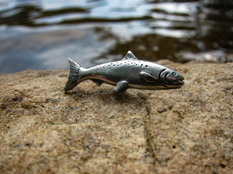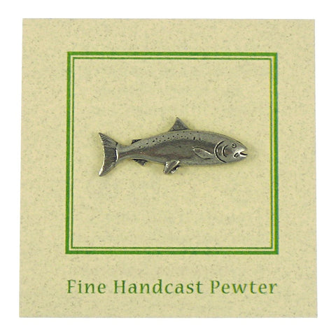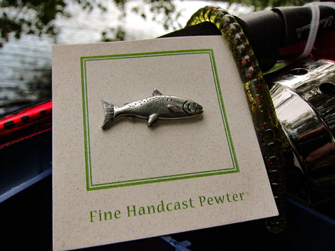 Celebrate that great catch with our hand cast pewter pins. Fishing enthusiasts can appreciate the unique designs, the careful craftsmanship, and the amazing attention to detail that characterizes Jim's work. Each of our salmon pins is handcrafted in our studio in Coventry, Rhode Island. Whether fishing in a lake, pond, or stream, or open water, stocked, or in the wild, our fish pins have great detail and will look sharp on a suit jacket, hat, or backpack. Individually packaged on our signature presentation cards, our pins arrive ready for gift- giving! We are happy to include a gift message to your favorite fisherman.