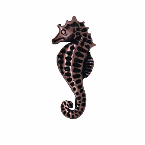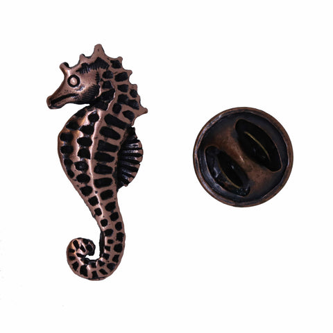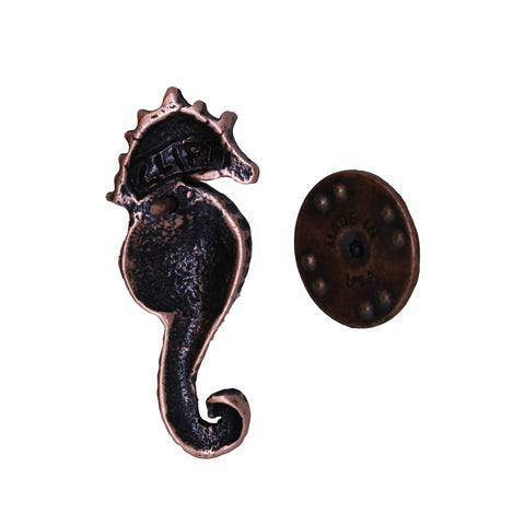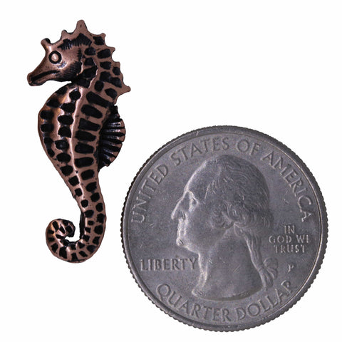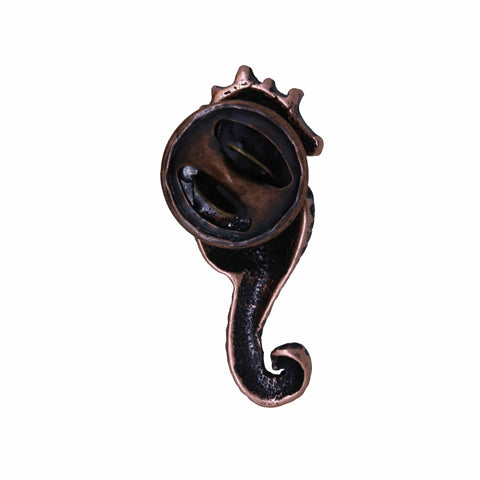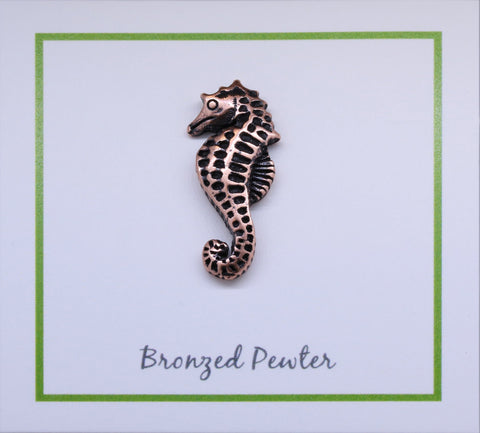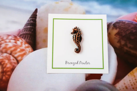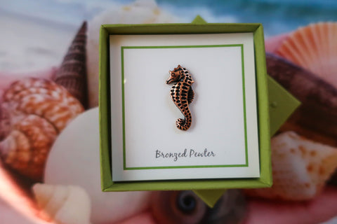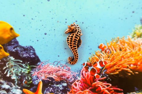 Seahorses are very special. Unlike most other fish, they are monogamous and mate for life. Rarer still, they are among the only animal species on Earth in which the male bears the unborn young. Our seahorse pin is hand cast in solid, lead-free pewter and then dipped in copper. All marine fish pins have a US made, military style clasp back to keep your pin secure on a coat, hat, or bag. The aquarium pins arrive packaged on our signature presentation cards, making them ready for gift-giving! Hosting an ocean conservation fundraiser, aquarium gift shop, or marine animal exhibit? Our custom card option allows you to design the front of the card to include a logo, information about your event, or a special message.