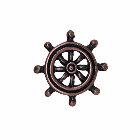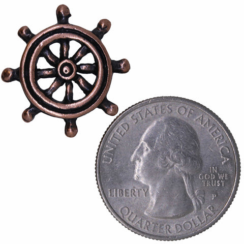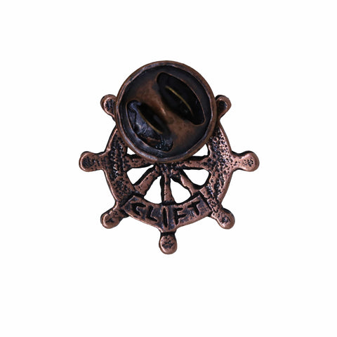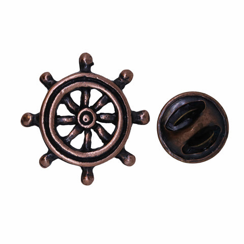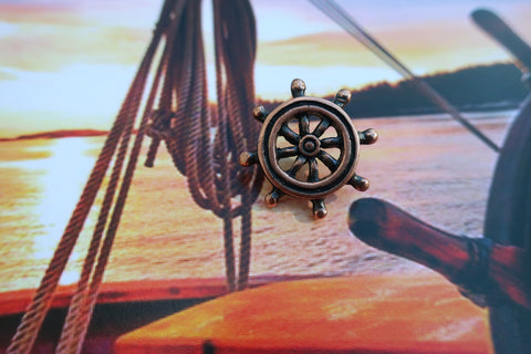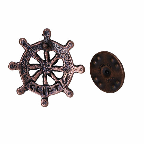 The ship's wheel symbolizes responsibility, clear approach and leadership. It appoints who’s in charge or at the helm. Show you’re the captain of your journey with our ship’s wheel lapel pin. Hand cast in solid, lead-free pewter and then dipped in copper, our helm pins have a US made, military style clasp back to keep your pin secure on a jacket, hat, or lanyard. Our boating pins arrive packaged on our signature presentation cards, making them ready for gift-giving!