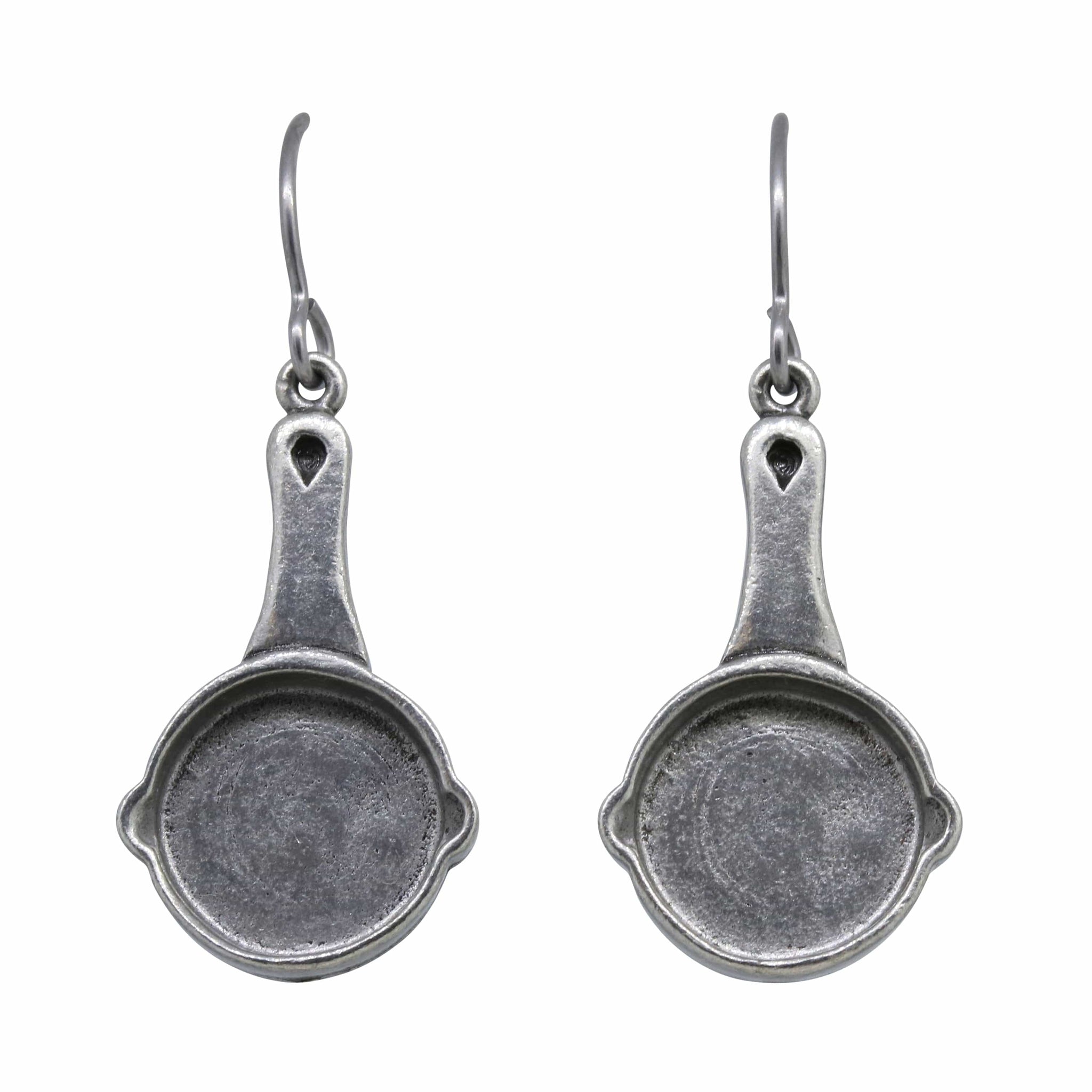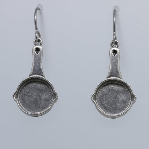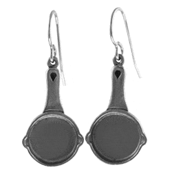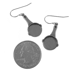 Our skillet earrings are hand cast in solid, lead-free pewter. They have stainless steel ear wires that are very corrosion resistant, clean, hypoallergenic and sturdy (also with a sleek, shimmering finish that won’t rust or tarnish). The frying pan dangles arrive packaged on our signature presentation card, nestled inside a beautiful gift box, making them ready for gift-giving!