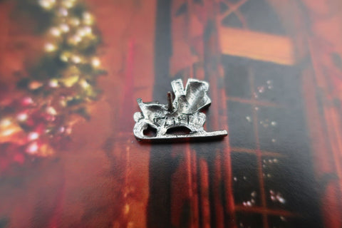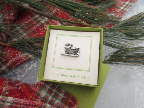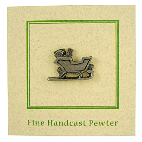 Celebrate the season with our sleigh pin. Hand cast in solid, lead-free pewter, our holiday pins have a US made, military style clasp back to keep your pin secure on a sweater, hat, or bag. All Christmas pins arrive packaged on our signature presentation cards, making them ready for gift-giving! Hosting a horse drawn carriage ride or holiday party? Our custom card option allows you to design the front of the card to include a logo, information about your event, or a special message.