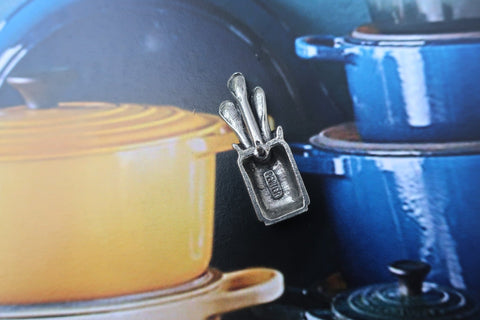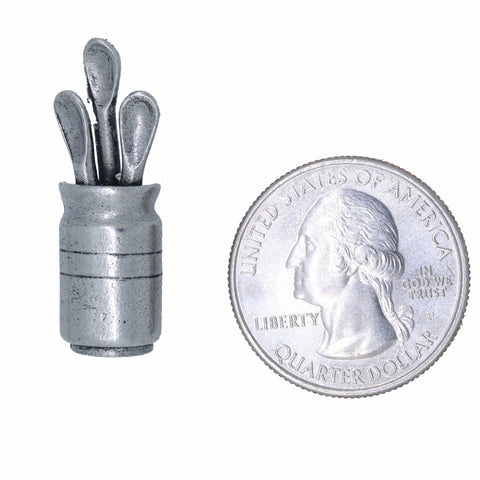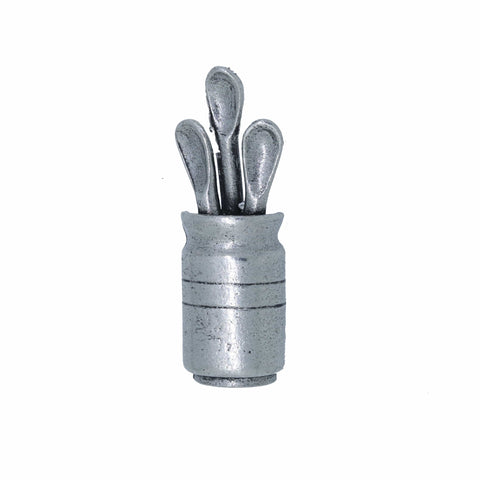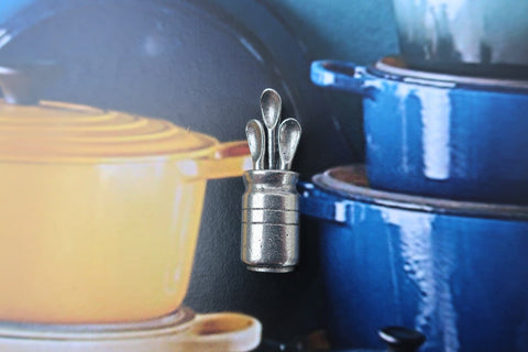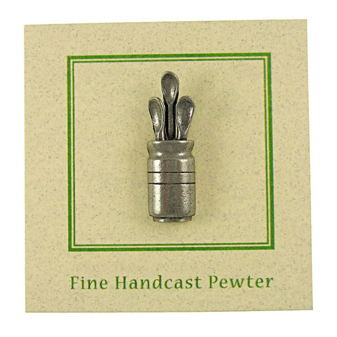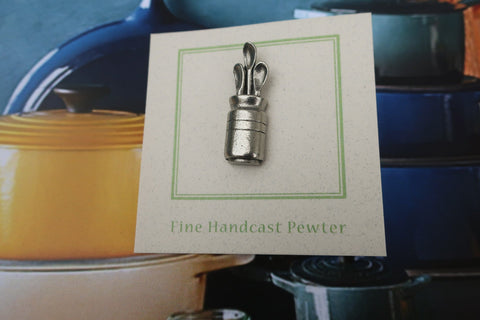 Show your love for everything culinary with our spoons in pot pin. Hand cast in solid, lead-free pewter, our kitchen pins have a US made, military style clasp back to keep your pin secure on an apron, coat, or hat. Our cooking pins arrive packaged on our signature presentation cards, making them ready for gift-giving!