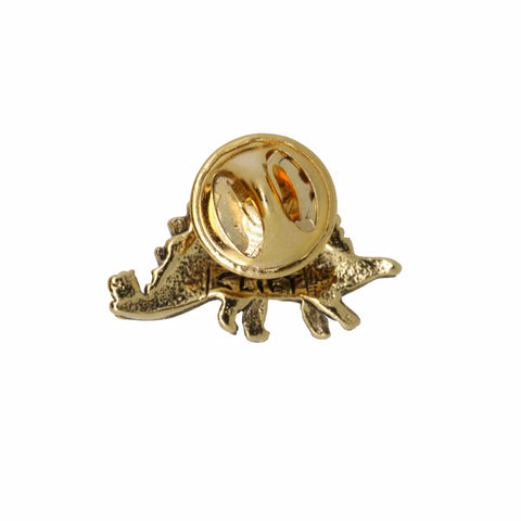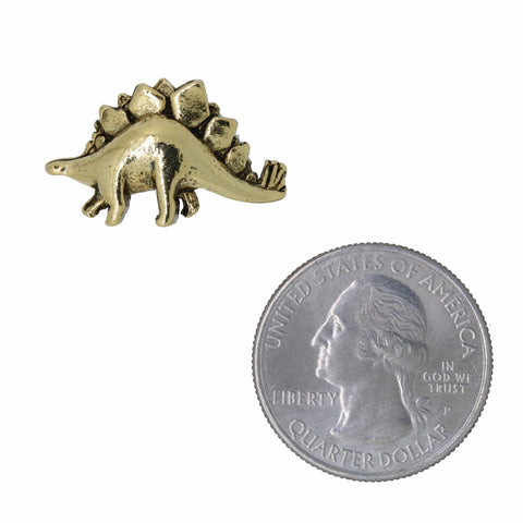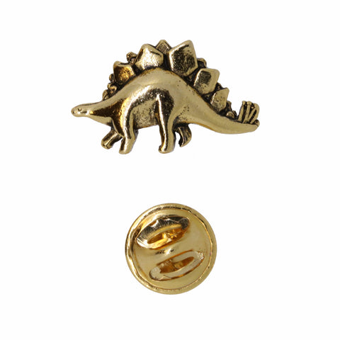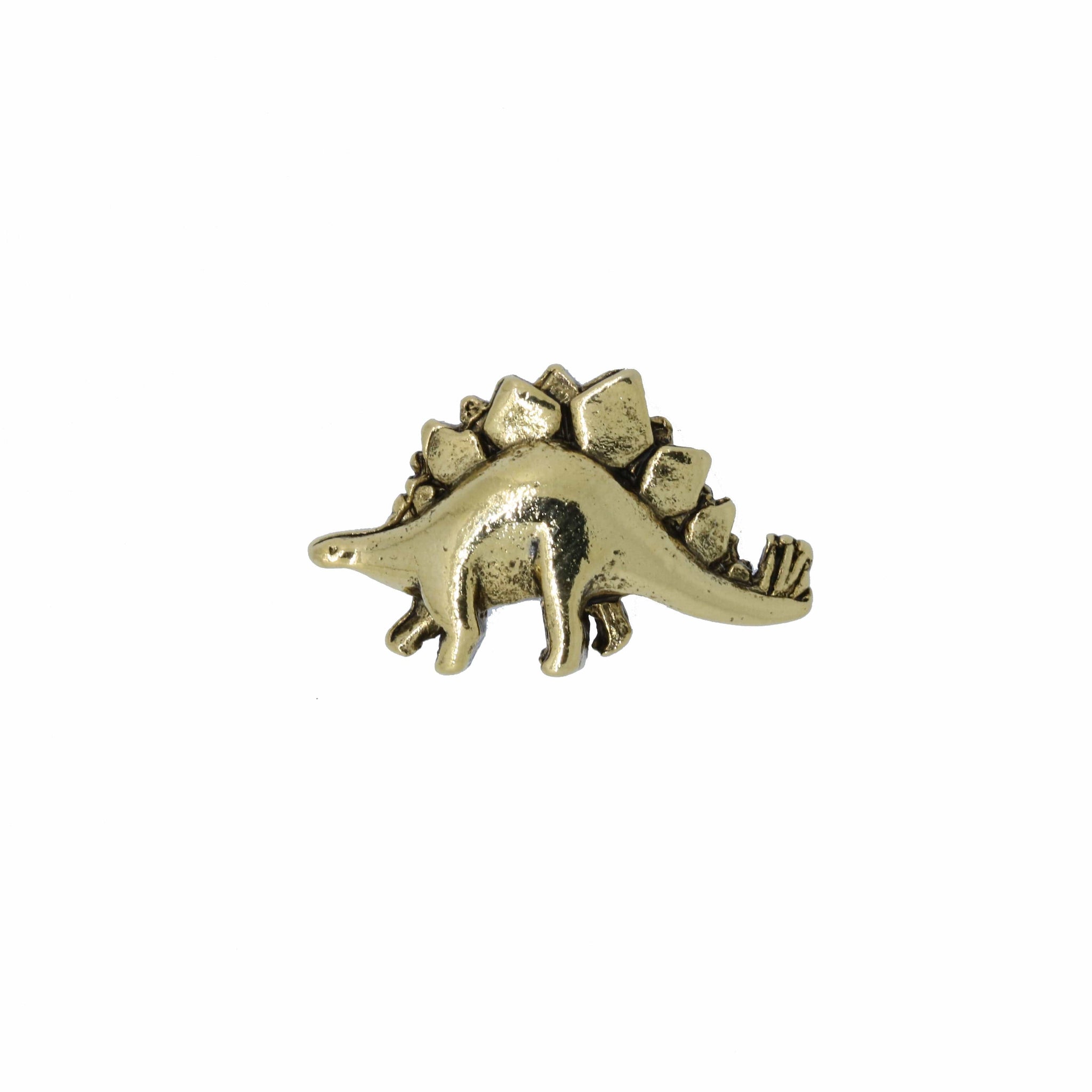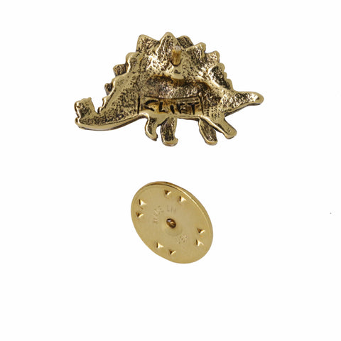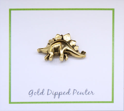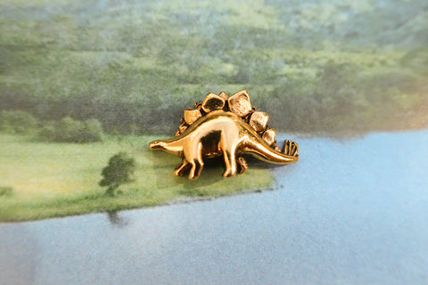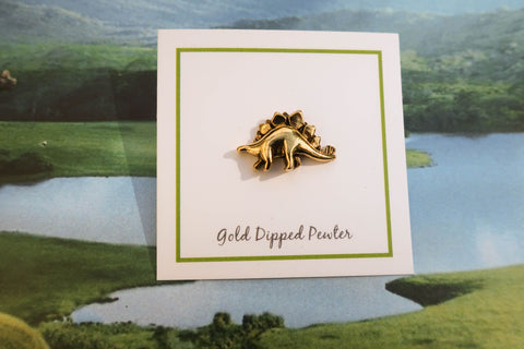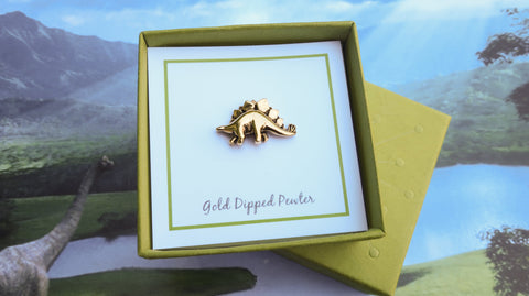 Show your fascination for dinosaurs with our stegosaurus pin. Our Jurassic pins are hand cast in solid, lead-free pewter and then dipped in 22K gold. All dinosaur pins have a secure, US made, military style clasp backing that keeps your herbivore pin fastened on a coat, hat, bag, or lanyard. Gift to a dinosaur enthusiast, paleontologist, or use as donor incentives for museum funding, all of our dino pins arrive packaged on our signature presentation card, making them ready for gift-giving! Our custom card option allows you to design the front of the card to include a logo, information about your event, or a special message.