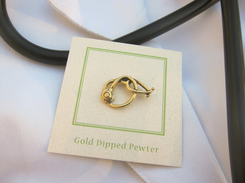 Nurses, Doctors, and Healthcare Professionals all appreciate the attention to detail of our Medical themed lapel pins. These hand cast stethoscope pins are great for Nursing Pinning Ceremonies, or to acknowledge the hard work and compassion of your nursing unit. The stethoscope arrives on a presentation card, making them ready for gift-giving! Our healthcare pins can be accompanied with a custom card with your hospital’s logo, a quote, or special message, making them great for conventions, events, and celebrations. Each stethoscope pin is hand cast from solid, lead-free pewter in our studio in RI and then dipped in gold.