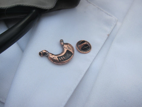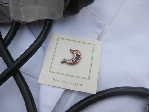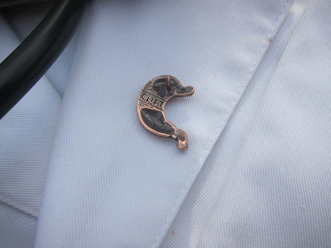 Nurses, Doctors, Med students, digestive specialists and gastroenterologists will all appreciate the attention to detail and uniqueness of our stomach lapel pin. Hand cast in solid, lead-free Fine Pewter and then dipped in copper, each piece is an original three-dimensional sculpture signed by the artist, Jim Clift. Our stomach pins come individually packaged on our signature presentation cards. Increase awareness of digestive diseases by wearing our unique medical pins. Enhance your gastrologist events with these stomach pins, great for donors and participants. Our medical pins are also a great way for showing appreciation for colleagues, students, and staff.