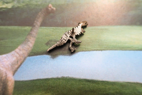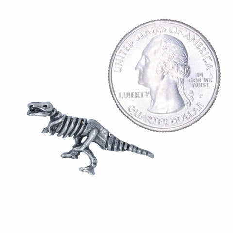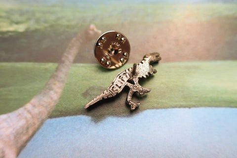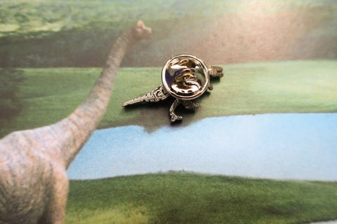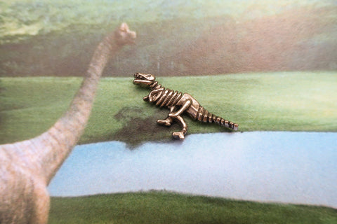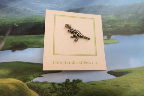 Show your fascination for dinosaurs with our tyrannosaurus rex pin.  Our Jurassic pins are hand cast in solid, lead free pewter.  All dinosaur pins have a secure, US made, military style clasp backing that keeps your t-rex pin fastened on a coat, hat, bag, or lanyard.  Gift to a dinosaur enthusiast, paleontologist, or use as donor incentives for museum funding, all of our t rex pins arrive packaged on our signature presentation card, making them ready for gift-giving!  Our custom card option allows you to design the front of the card to include a logo, information about your event, or a special message.