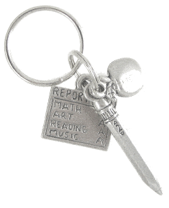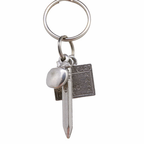 Add some flair or personalization to your set of keys with our hand cast pewter teacher key chain. Our education keyring has three separate charms, an apple, pencil, and report card hanging beautifully from a ring. The perfect gift or accessory to show appreciation for teachers and educators.