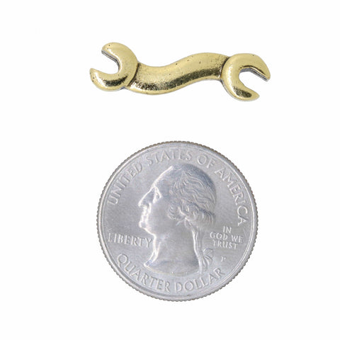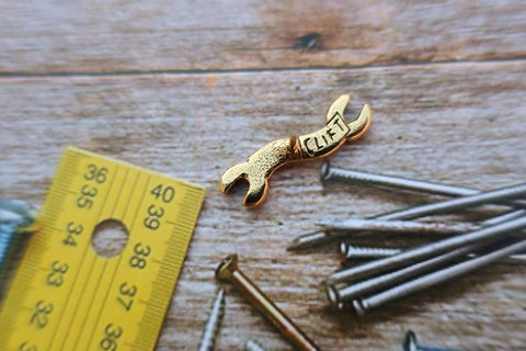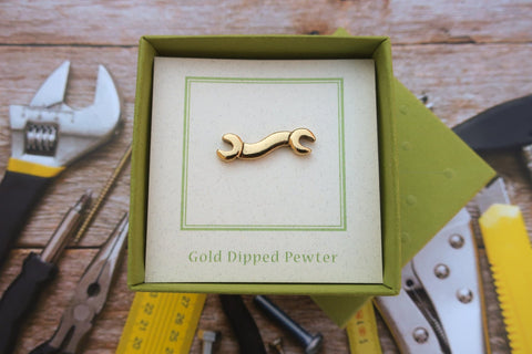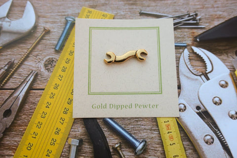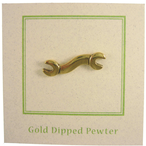 Show your interest in renovation and construction with our wrench pin. Hand cast in solid, lead-free pewter and then dipped in 22K gold, our tool pins have US made, military style clasp backs to keep your pin secure on a coat, hat, or bag. Our building pins arrive packaged on our signature presentation card, making them ready for gift-giving! Award habitat for humanity volunteers, your construction crew, or favorite handyman. Our custom card option allows you to design the front of the card to include a logo, information about your event, or a special message.